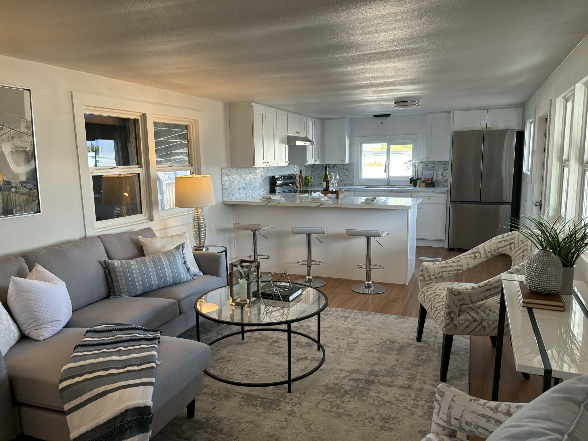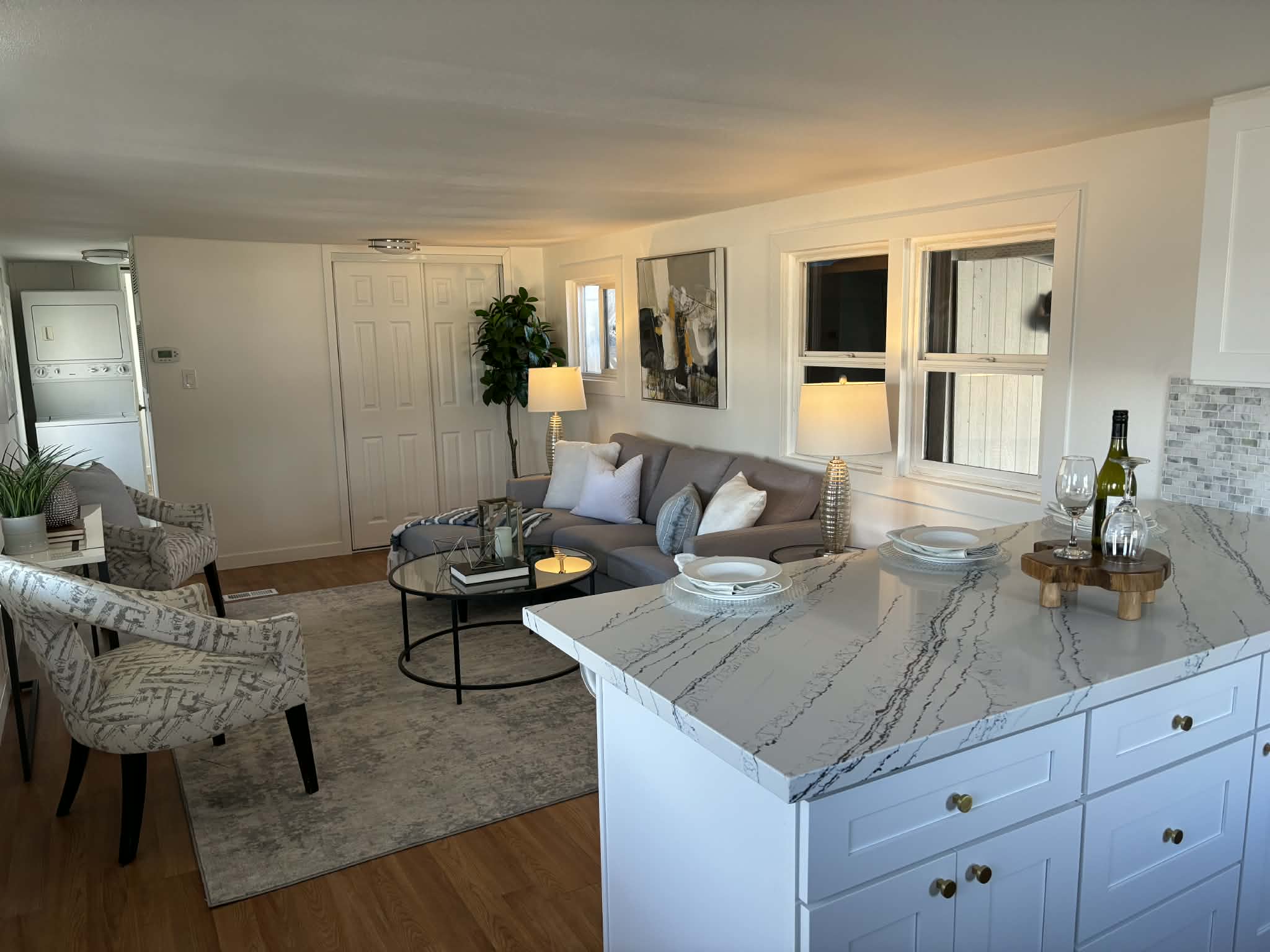 The oversized living room offers an open, airy feel and flows seamlessly into the kitchen, highlighted by a beautiful breakfast bar—perfect for casual dining or entertaining. An additional closet in the living room provides convenient extra storage for utility items.