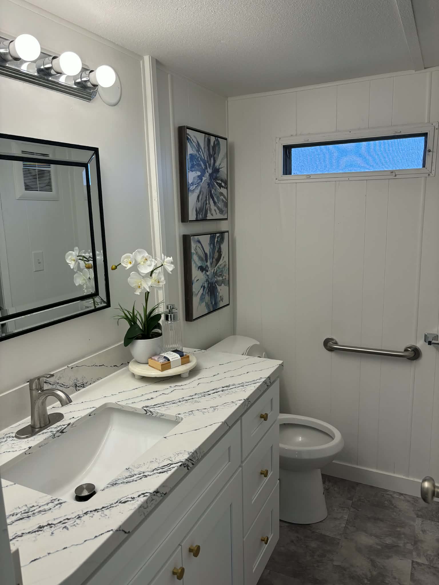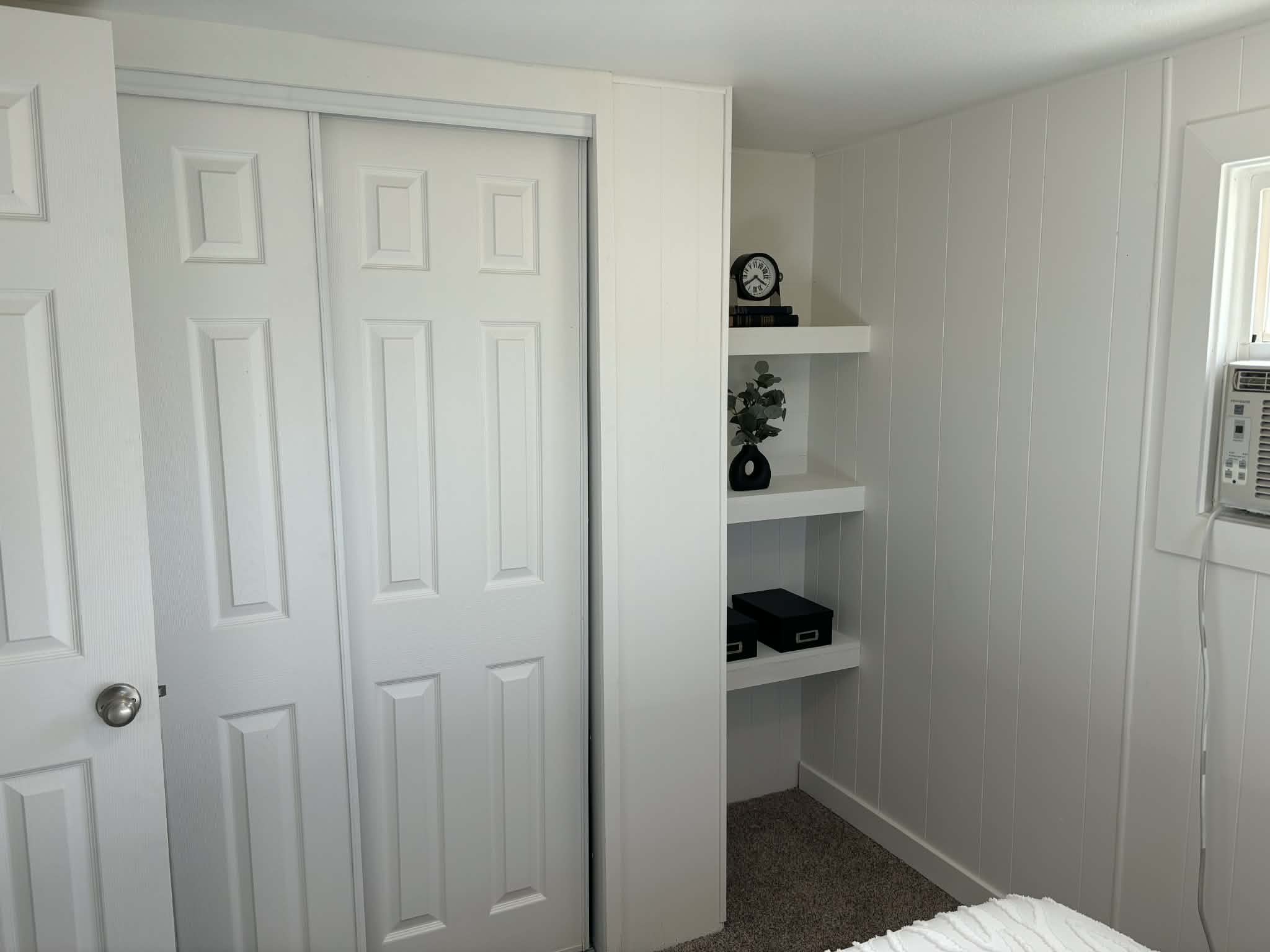 The bathroom has been completely updated with a new covered countertop and a spacious walk-in shower, creating a fresh and modern feel throughout.
